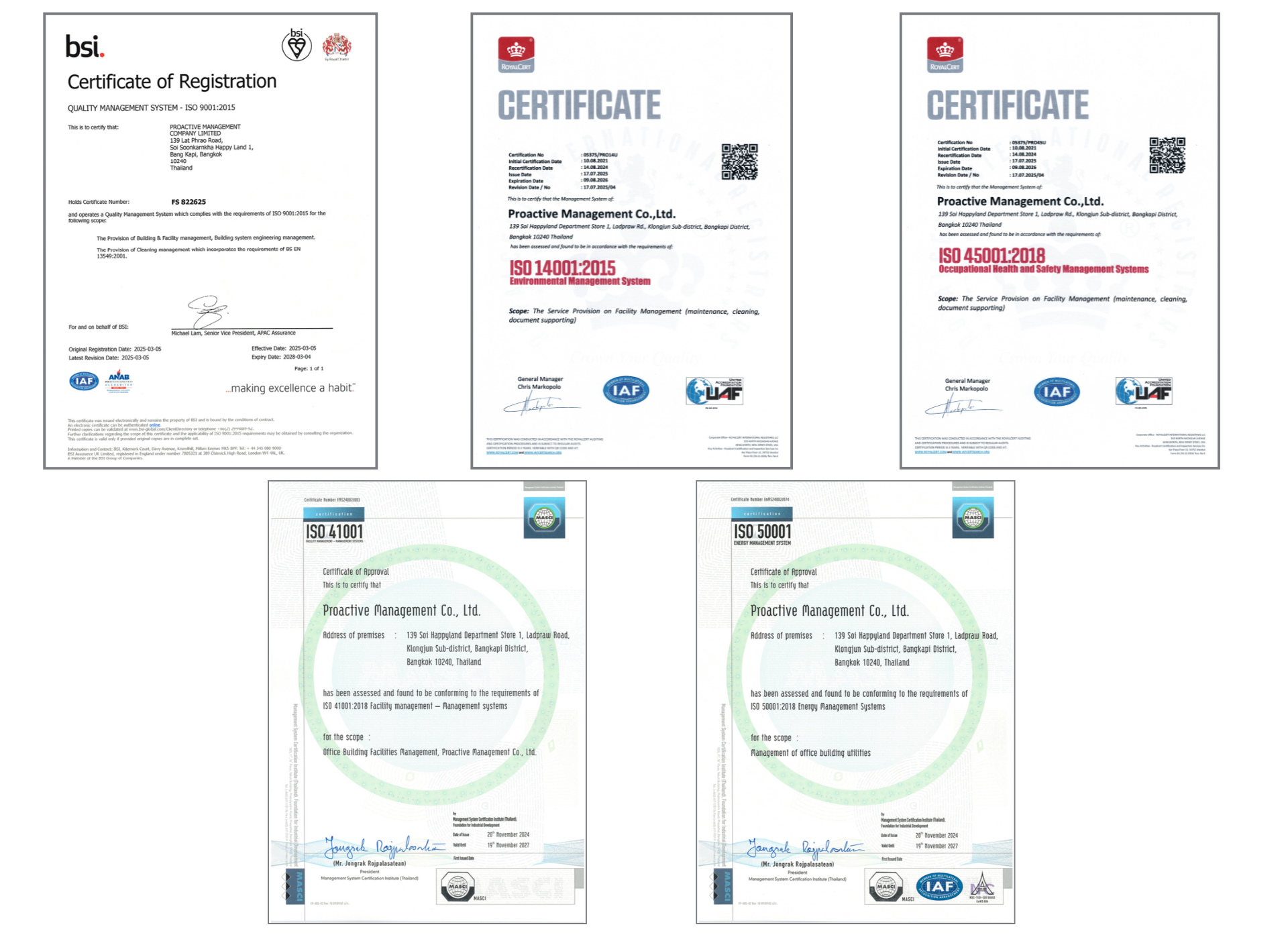 หลังจากได้รับการรับรองมาตรฐาน ISO 9001 ทุกปี จนมาวันนี้เราตระหนักถึงการทำงานที่มุ่งเน้นรักษาสิ่งแวดล้อม ควบคู่ไปกับการสร้างสภาพแวดล้อมที่ปลอดภัยต่อการทำงานของเจ้าหน้าที่ เราจึงตั้งใจให้ธุรกิจเดินหน้าไปพร้อมการทำงานที่มาตรฐานสากลเพิ่มขึ้นมากขึ้น จึงเป็นที่มาในการทำงานอย่างหนักภายในองค์กร จนได้รับการรับรองมาตรฐาน ISO 9001, ISO 14001, ISO 45001, ISO 41001 และ ISO 50001 ในปัจจุบัน