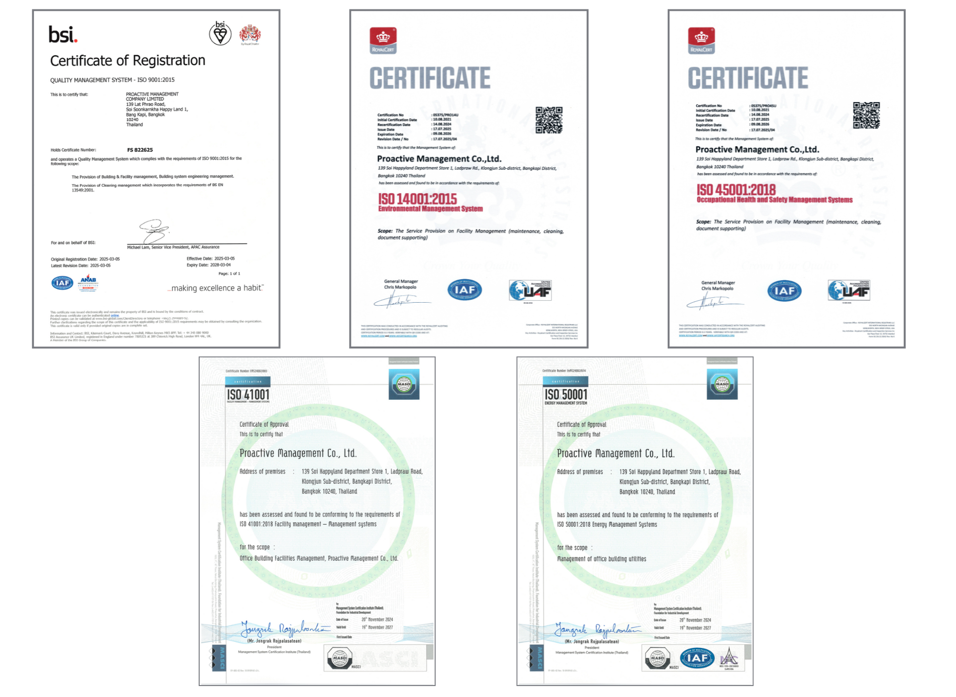 หลังจากได้รับการรับรองมาตรฐาน ISO 9001 ทุกปี จนมาวันนี้เราตระหนักถึงการทำงานที่มุ่งเน้นรักษาสิ่งแวดล้อม ควบคู่ไปกับการสร้างสภาพแวดล้อมที่ปลอดภัยต่อการทำงานของเจ้าหน้าที่ เราจึงตั้งใจให้ธุรกิจเดินหน้าไปพร้อมการทำงานที่มาตรฐานสากลเพิ่มขึ้นมากขึ้น จึงเป็นที่มาในการทำงานอย่างหนักภายในองค์กร จนได้รับการรับรองมาตรฐาน ISO 9001, ISO 14001, ISO 45001, ISO 41001 และ ISO 50001 ในปัจจุบัน